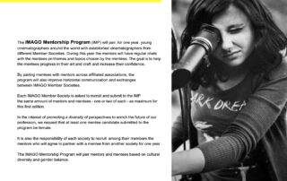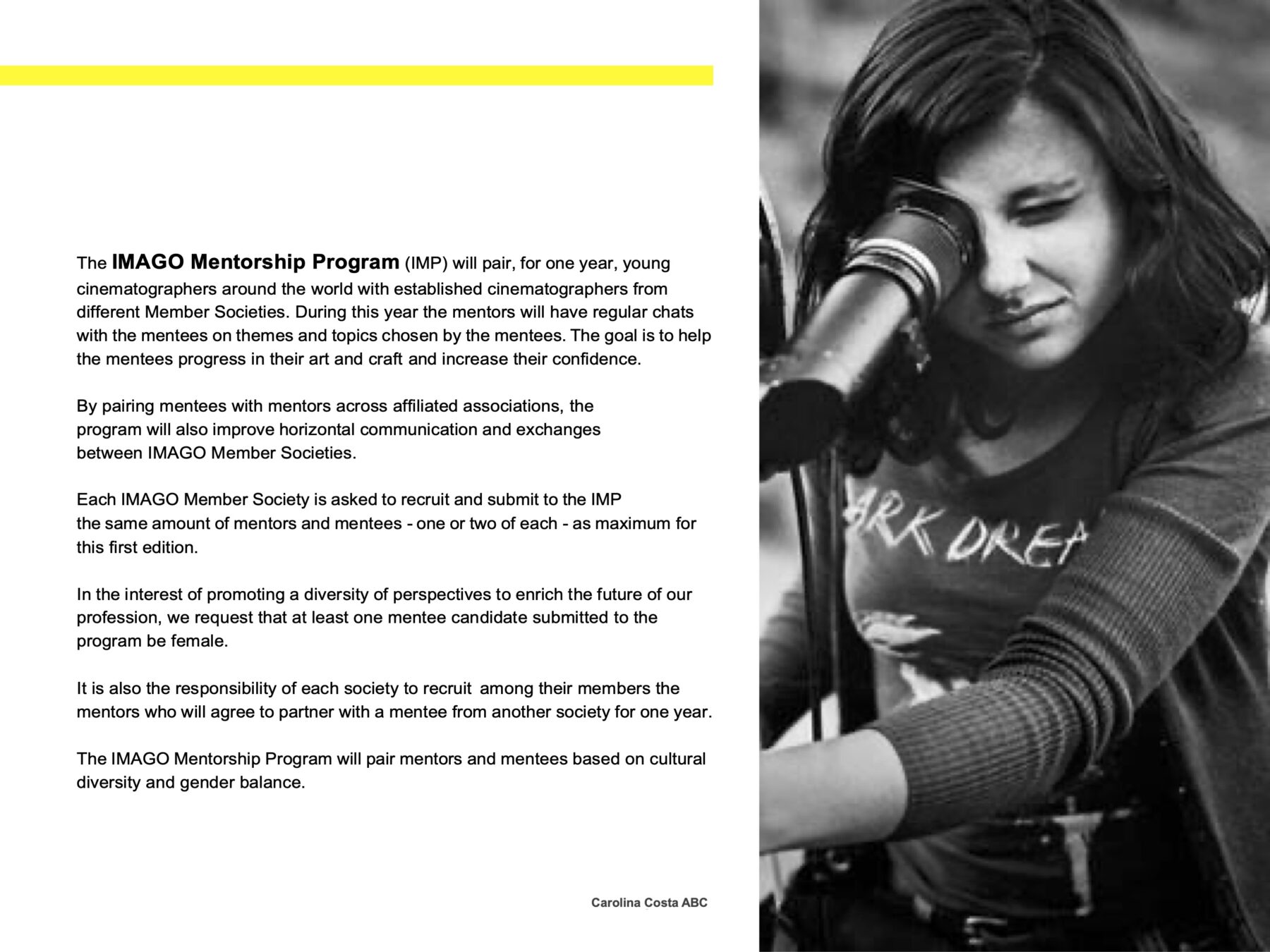 Jeder Mitgliedsverband von IMAGO ist eingeladen, zwei Mentorinnen und Mentoren (erfahrene Fachleute aus dem Dokumentar- oder Spielfilmbereich) und zwei Mentees (motivierte Nachwuchs-Kameraleute) zu nominieren.